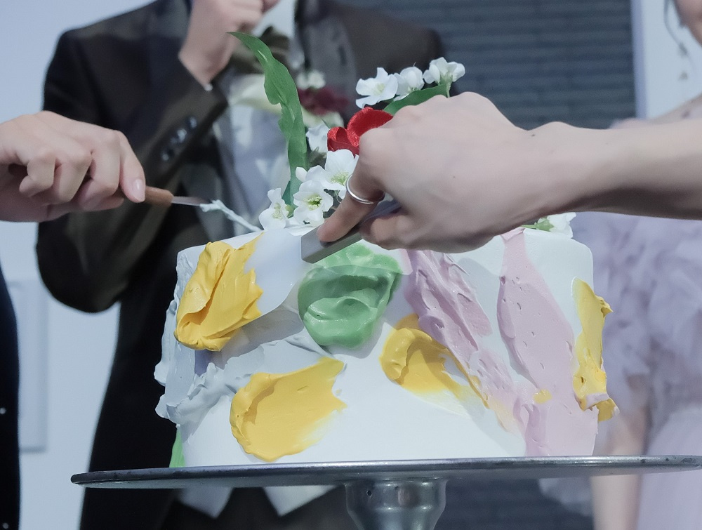 新郎新婦様が色付きのクリームをまるで絵の具のパレットのようにデザインしたり