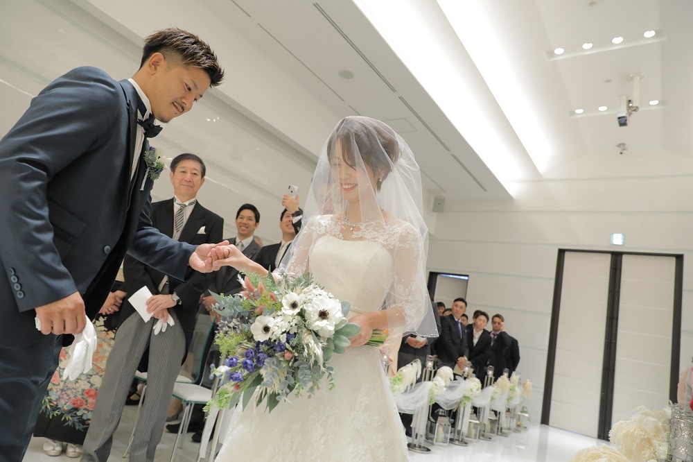 そして新郎様と出会い、お父様から新郎様へバトンタッチ。