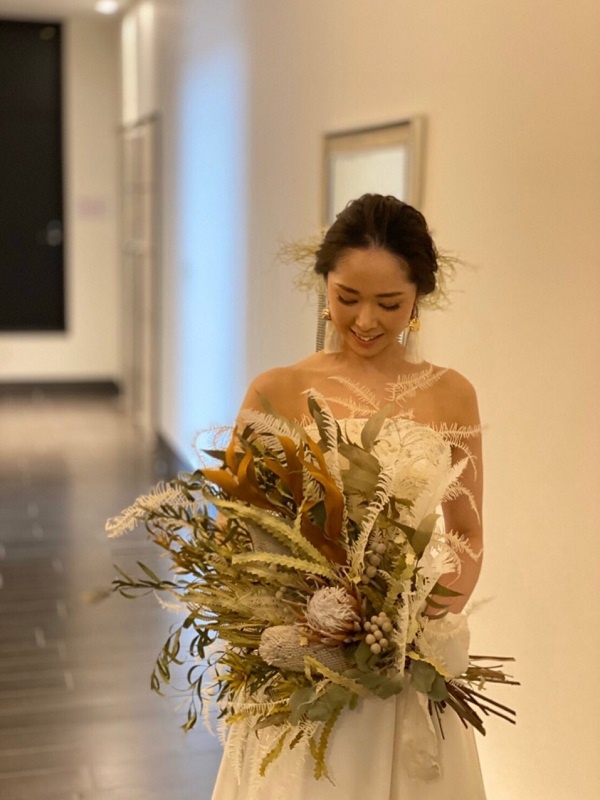 花を半円形に集めて作った丸く可愛らしいブーケです