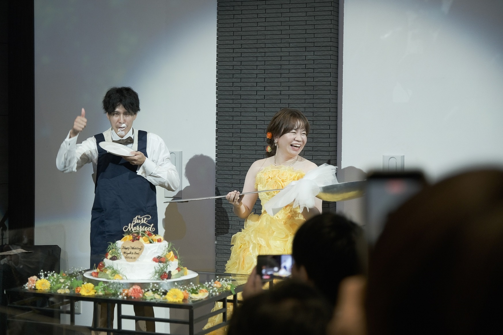 悪戯心のある新婦様の笑顔、クリームたっぷりで幸せそうな新郎様の笑顔に