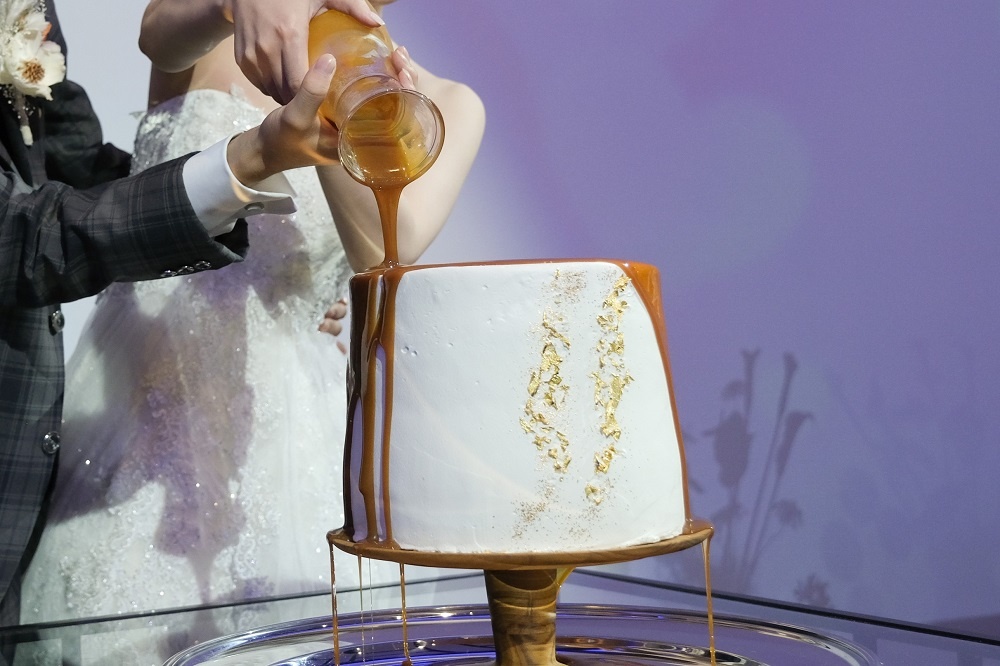 ソースをかける前とかけた後でウェディングケーキのデザインや雰囲気がガラッと変わり