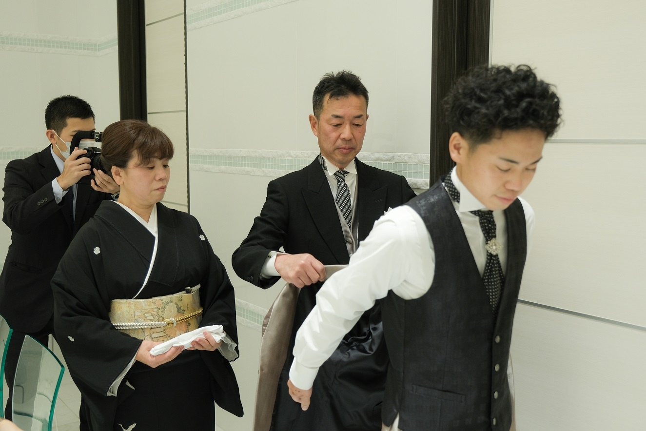 入り口付近でお父様よりジャケットセレモニー、お母様よりブートニアをセットしていただきます。
