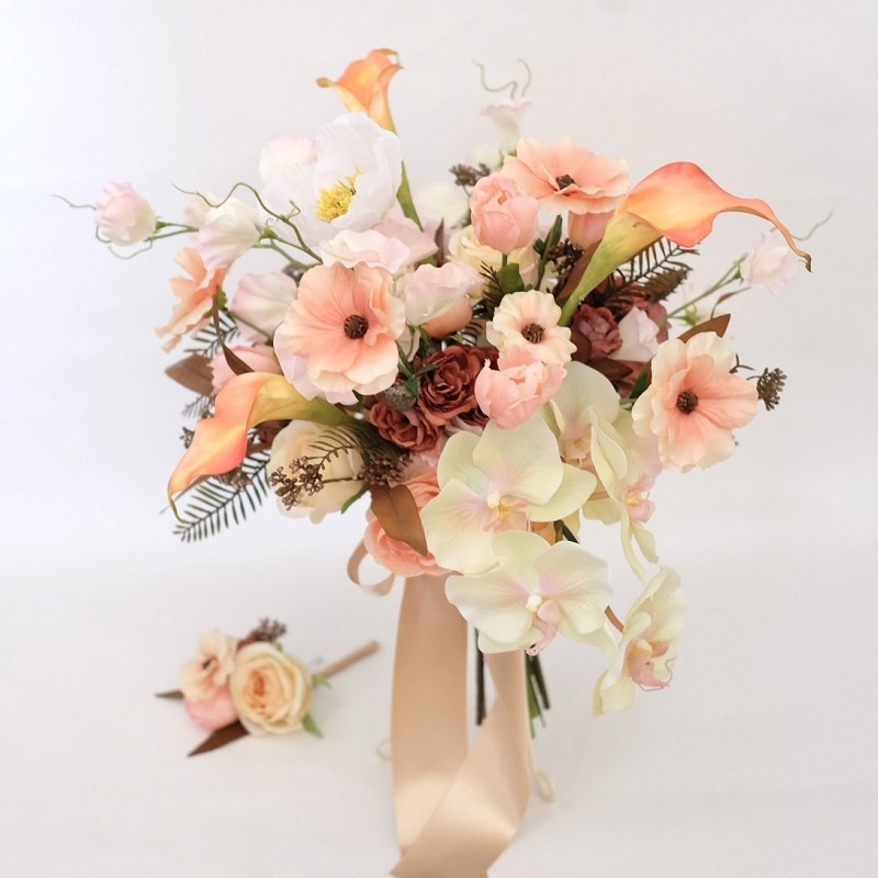 オーダーブーケのメリットは、新婦様の好きなお花やドレスの色味に合わせて作成でき、