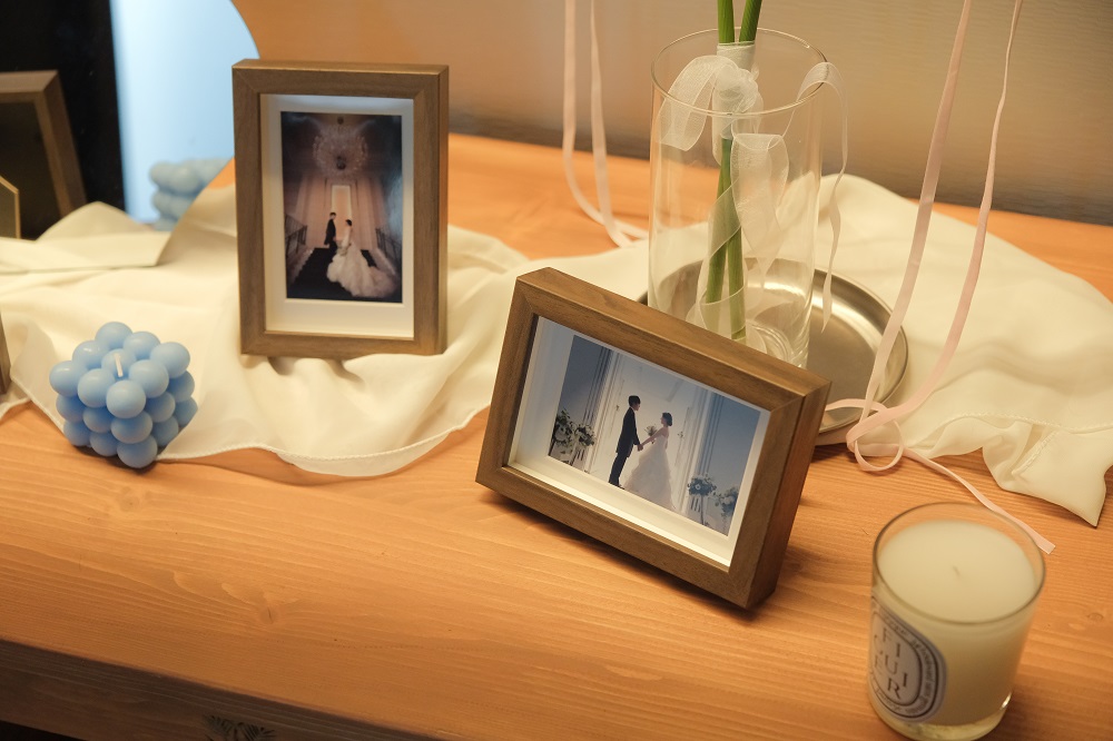 ウェルカムスペースはお2人がお持込されたグッズで可愛く飾っていただき、横にはウェルカムボードに見せかけて前撮りデータで作成したアルバムを!!♡