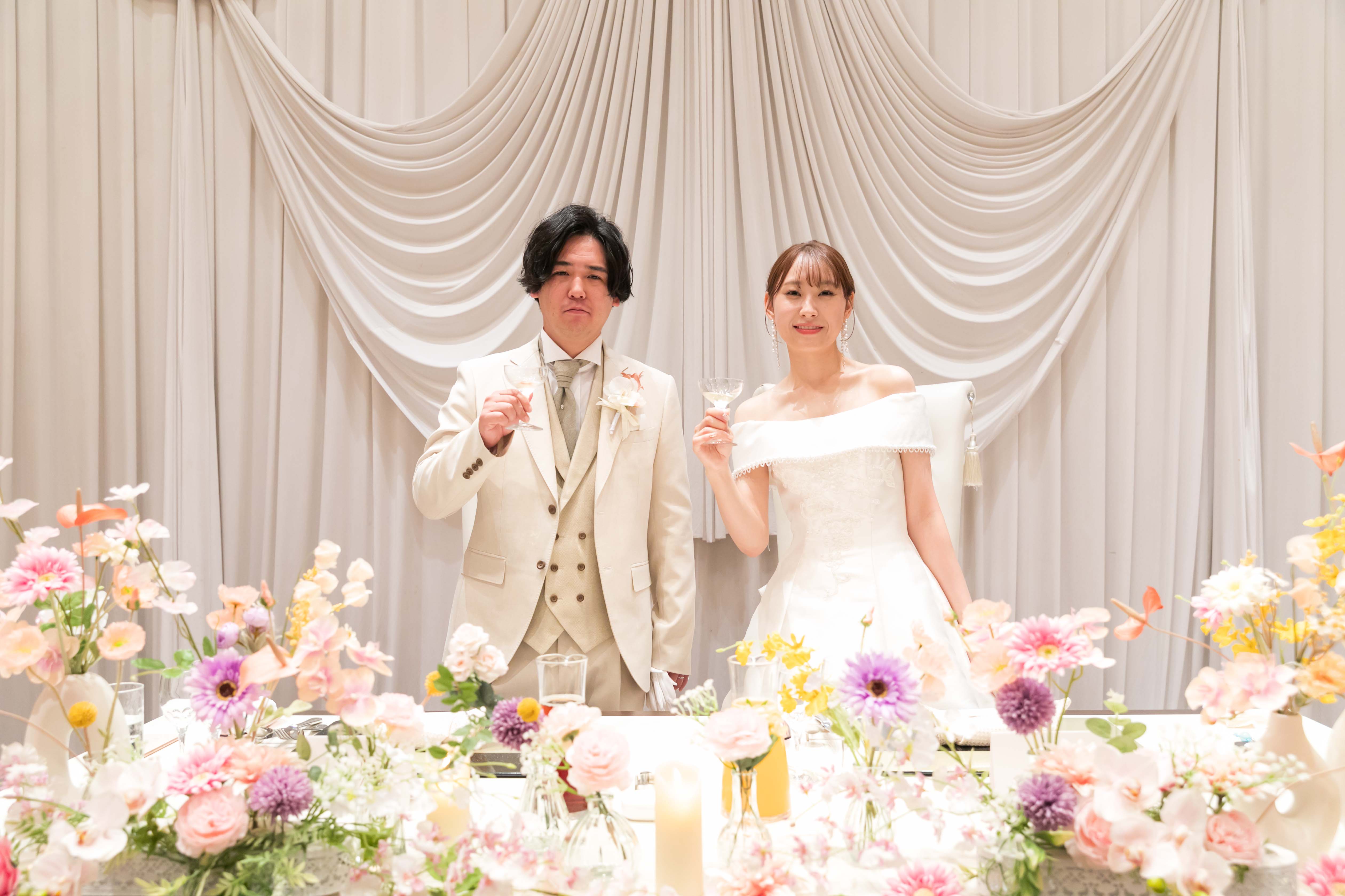 メインテーブルのお花とおふたりの笑顔が相性抜群です✨