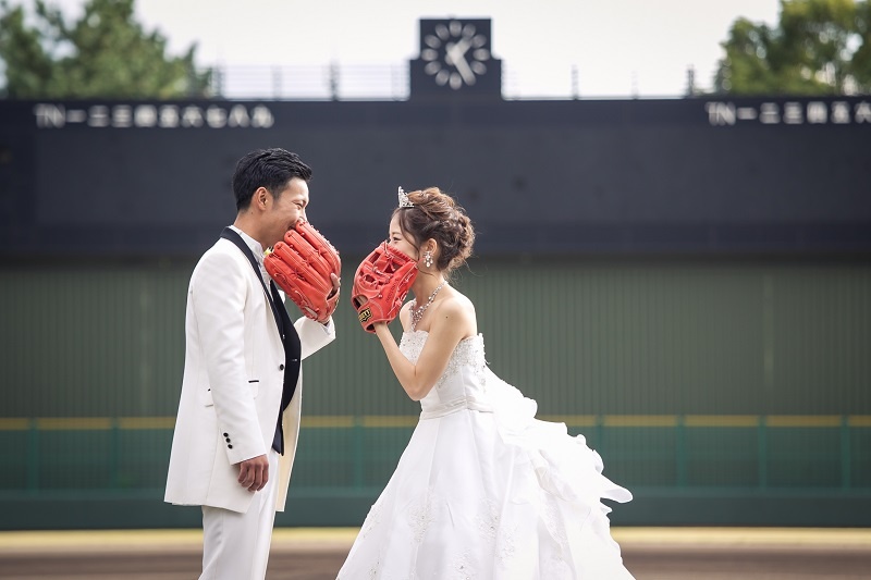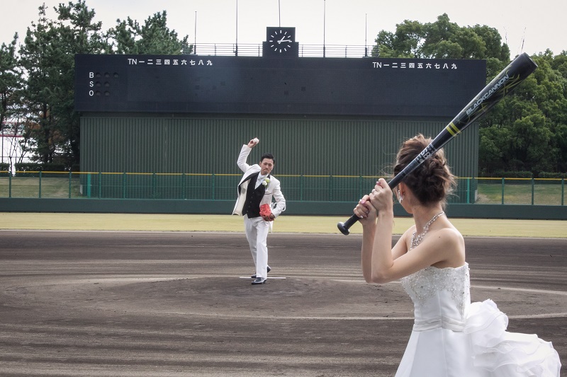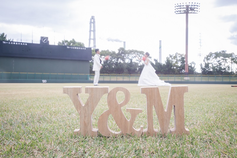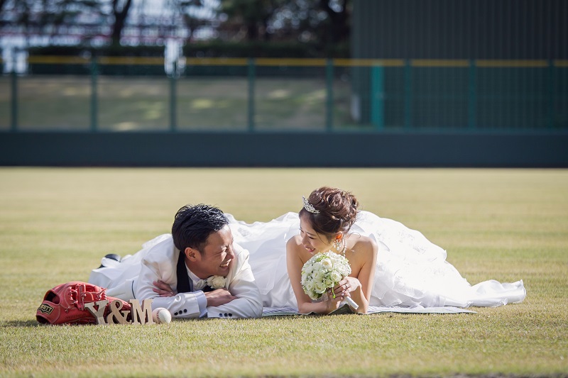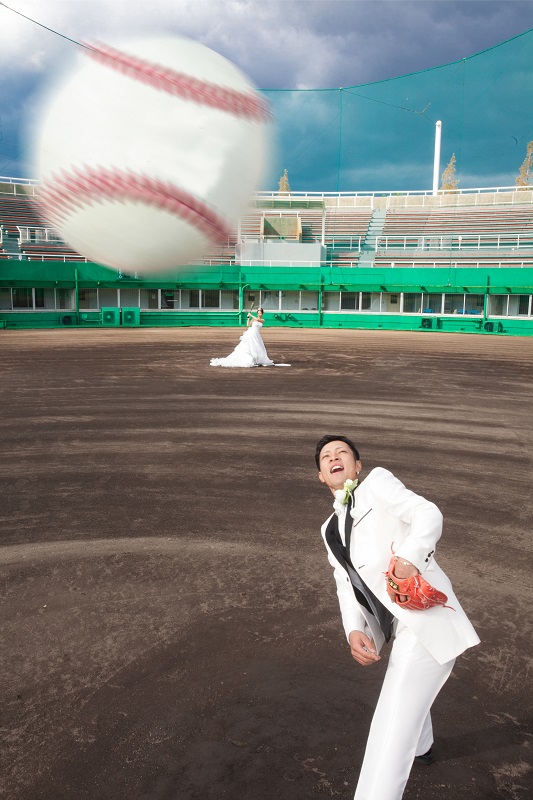 本日は前撮のロケーション撮影で野球場でのお写真をご紹介です