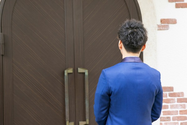 扉の前に立つ新郎様の表情は