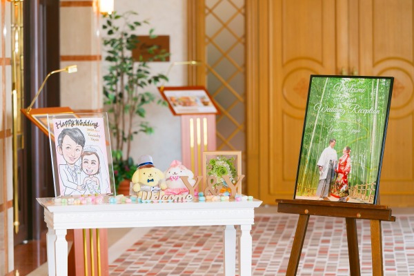 親御様やご親族の方は、和装をみたかったそうなのでウェルカムスペースに前撮りのお写真を