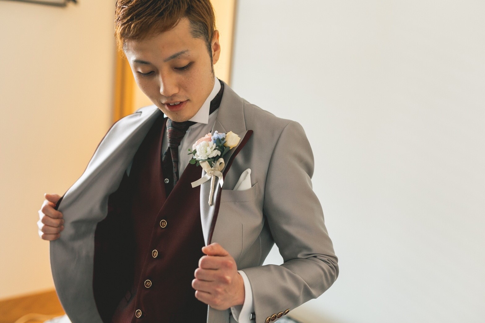 緊張しながらもタキシードに着替え