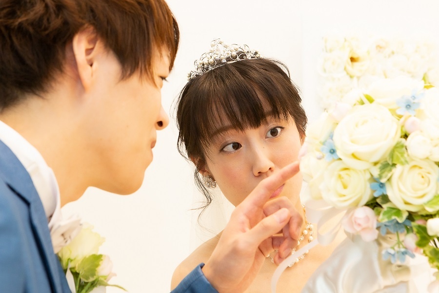 新郎新婦様でブーケを見てお話し中(*‘∀‘)(^^♪