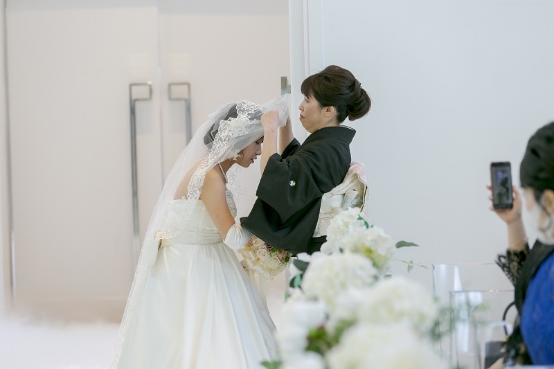 挙式が始まり、新婦様の最後のお支度としてお母様に