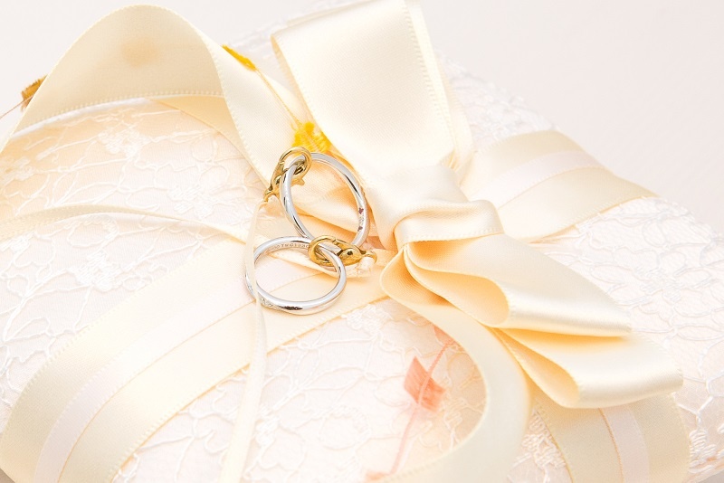 リングピローはリボンに指輪を通したり、