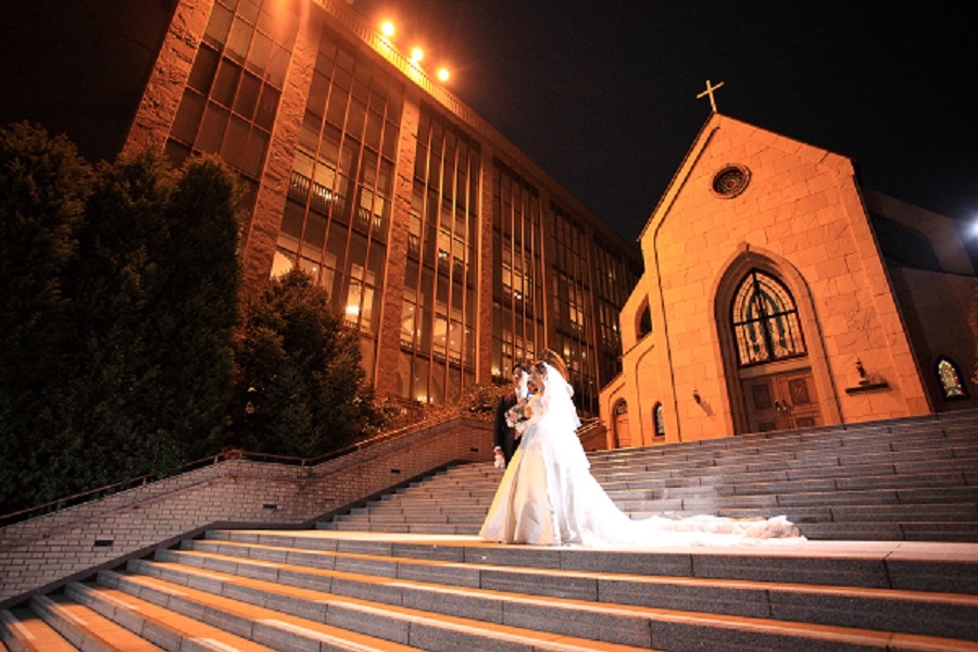 ライトなどで照らされたチャペルをバックに写真を撮るとロマンチックですね☆