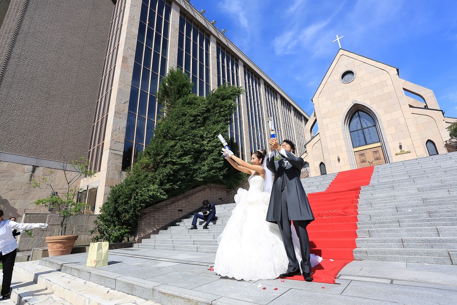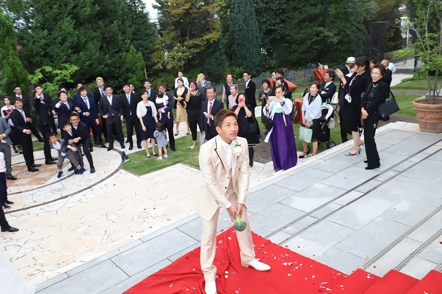 最近は新婦様がブーケトスをするならと新郎様もしてもらいます\(^o^)/
