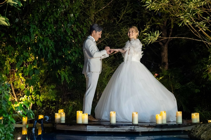 御披露宴中に水上のバルコニーにご登場された新郎新婦様( *´艸`)