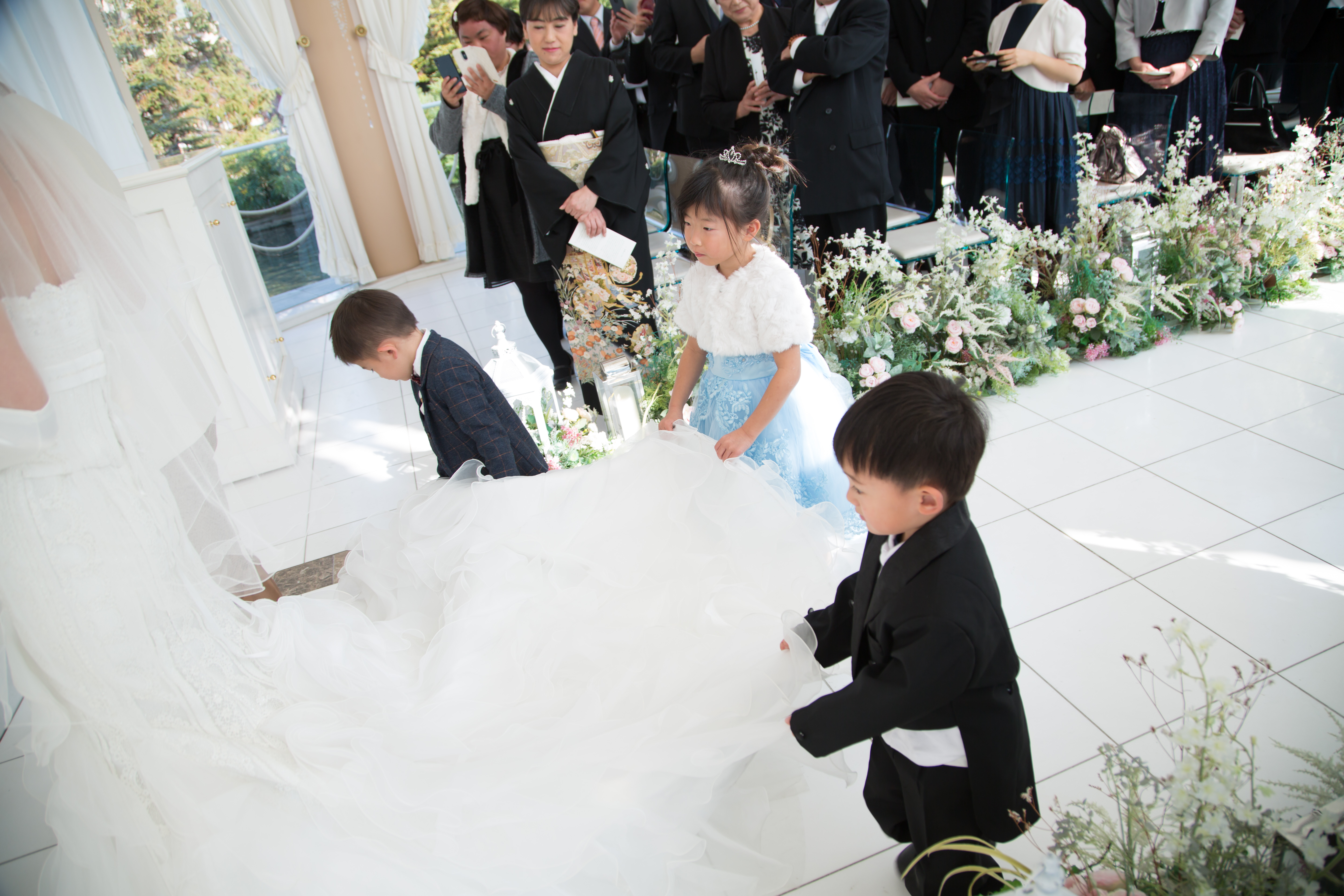 新婦様のドレスの裾をもって、新婦様と一緒にご入場して頂く演出なので