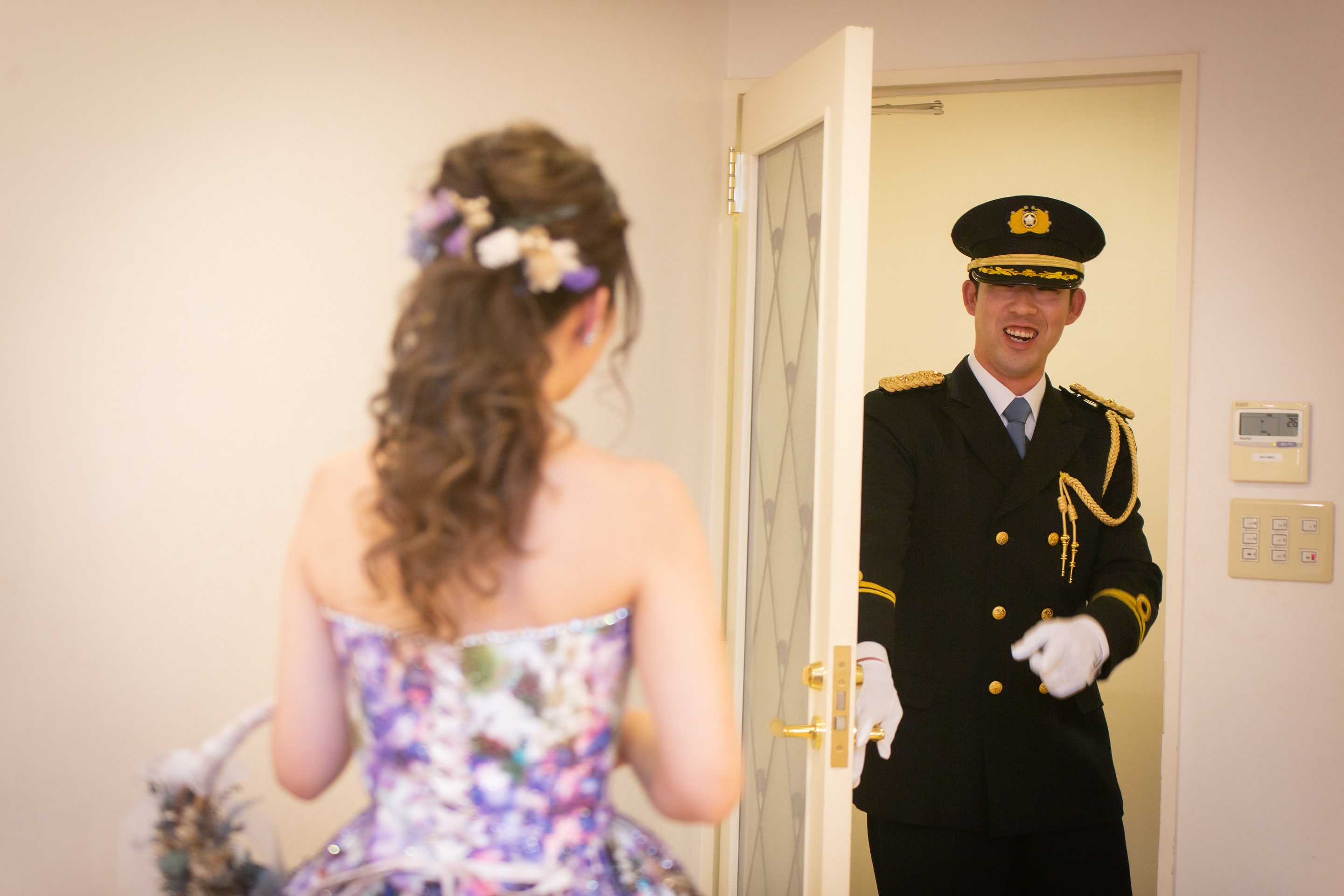 新婦様が待つプリンセスルームへ新郎様をご案内。