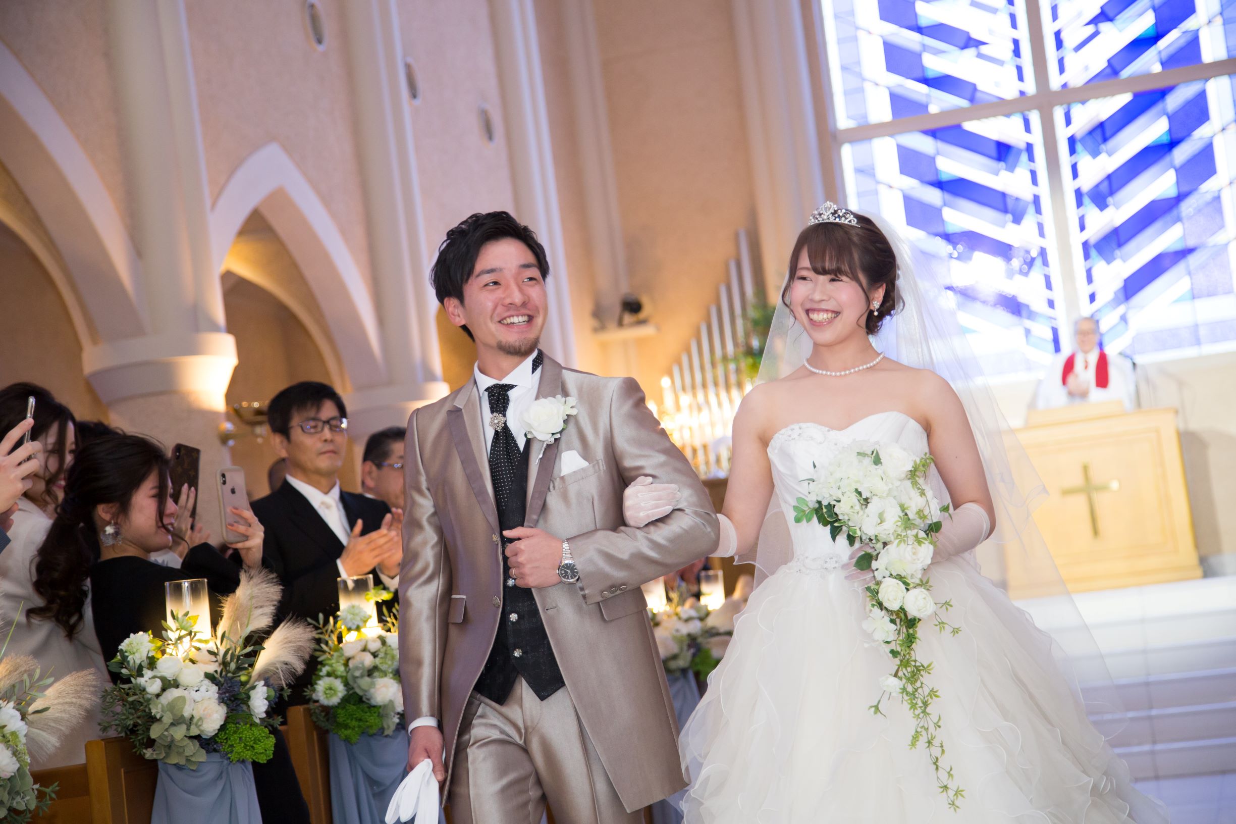 ブルーのステンドグラスがバージンロードに反射してとっても素敵です(^_-)-☆
