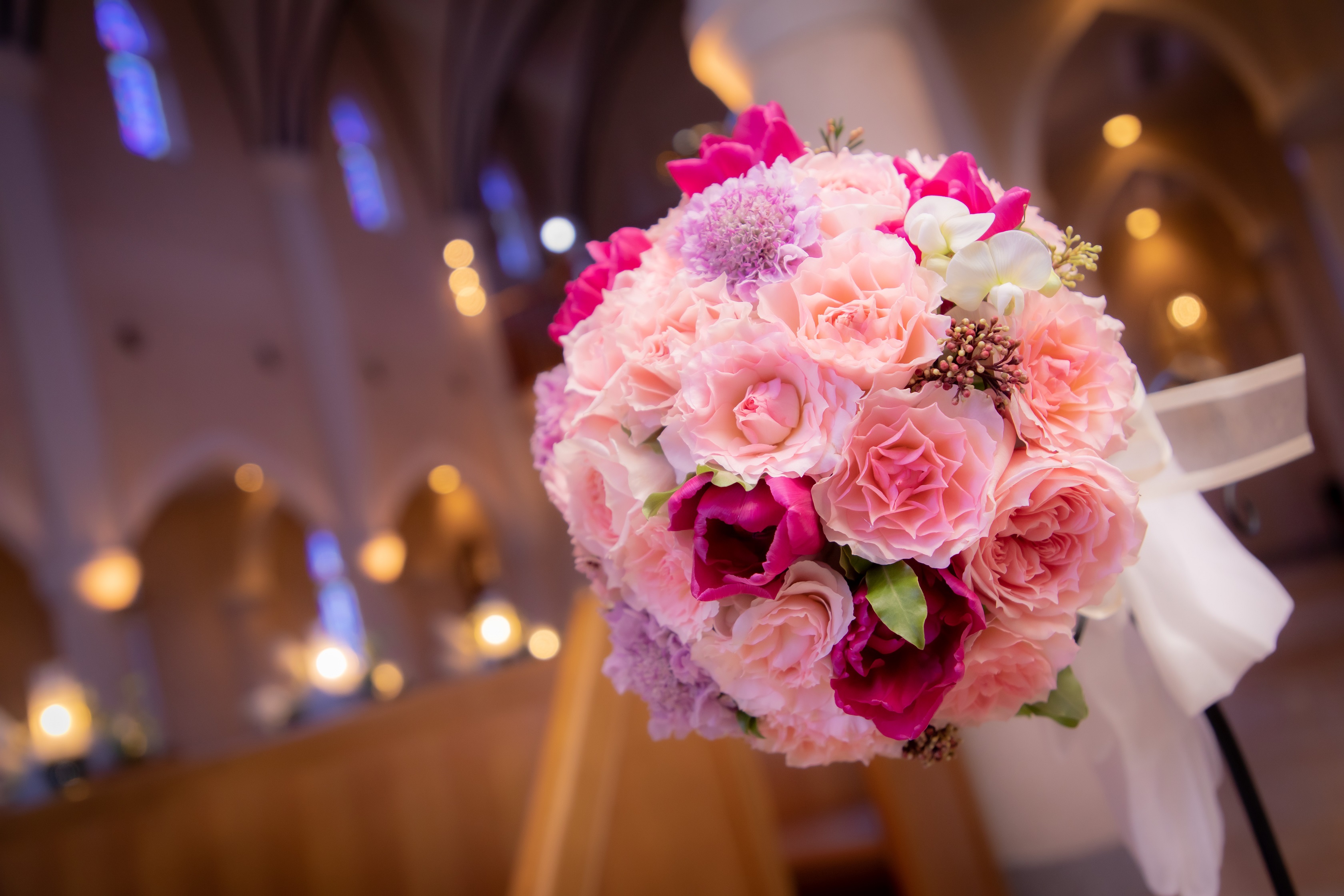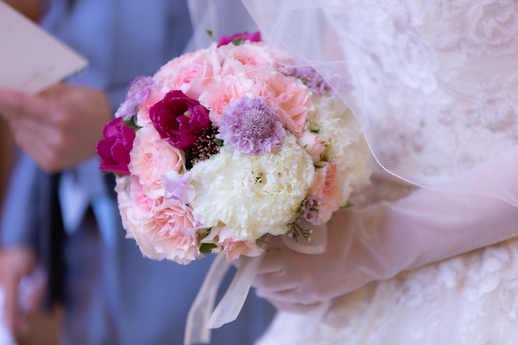 そして新婦様にはピンクカラーのラウンドブーケ。
