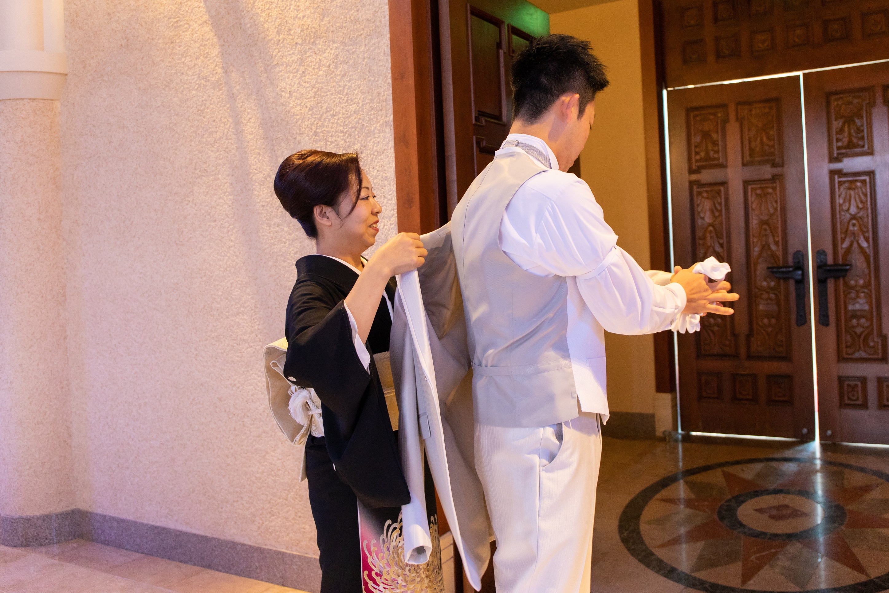 新郎様のお母様による新郎様のお支度のお手伝い