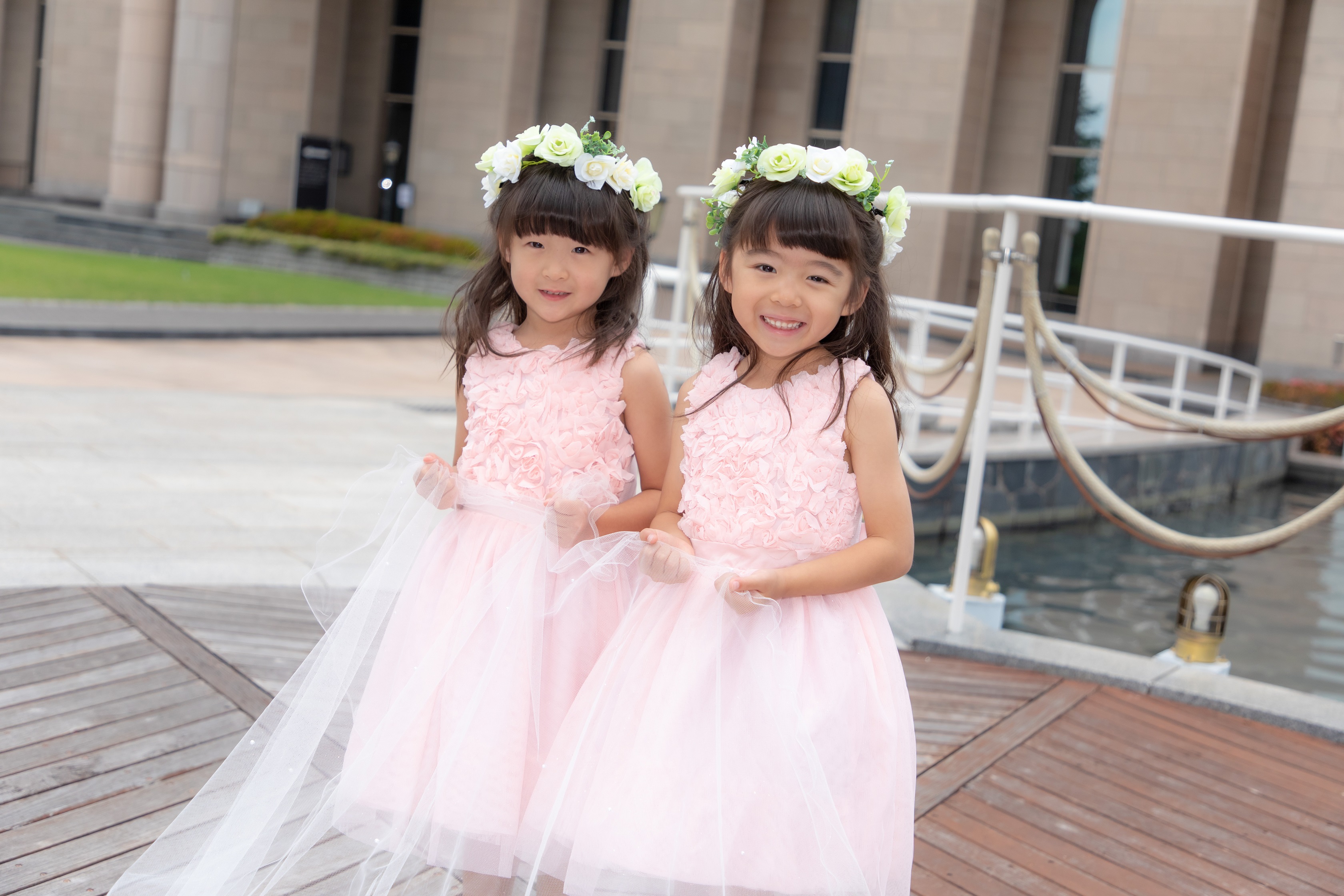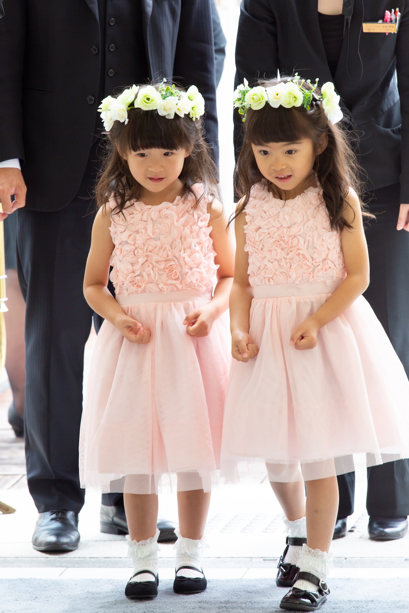 挙式の入場時、ドレスのトレーンをもつお子様を