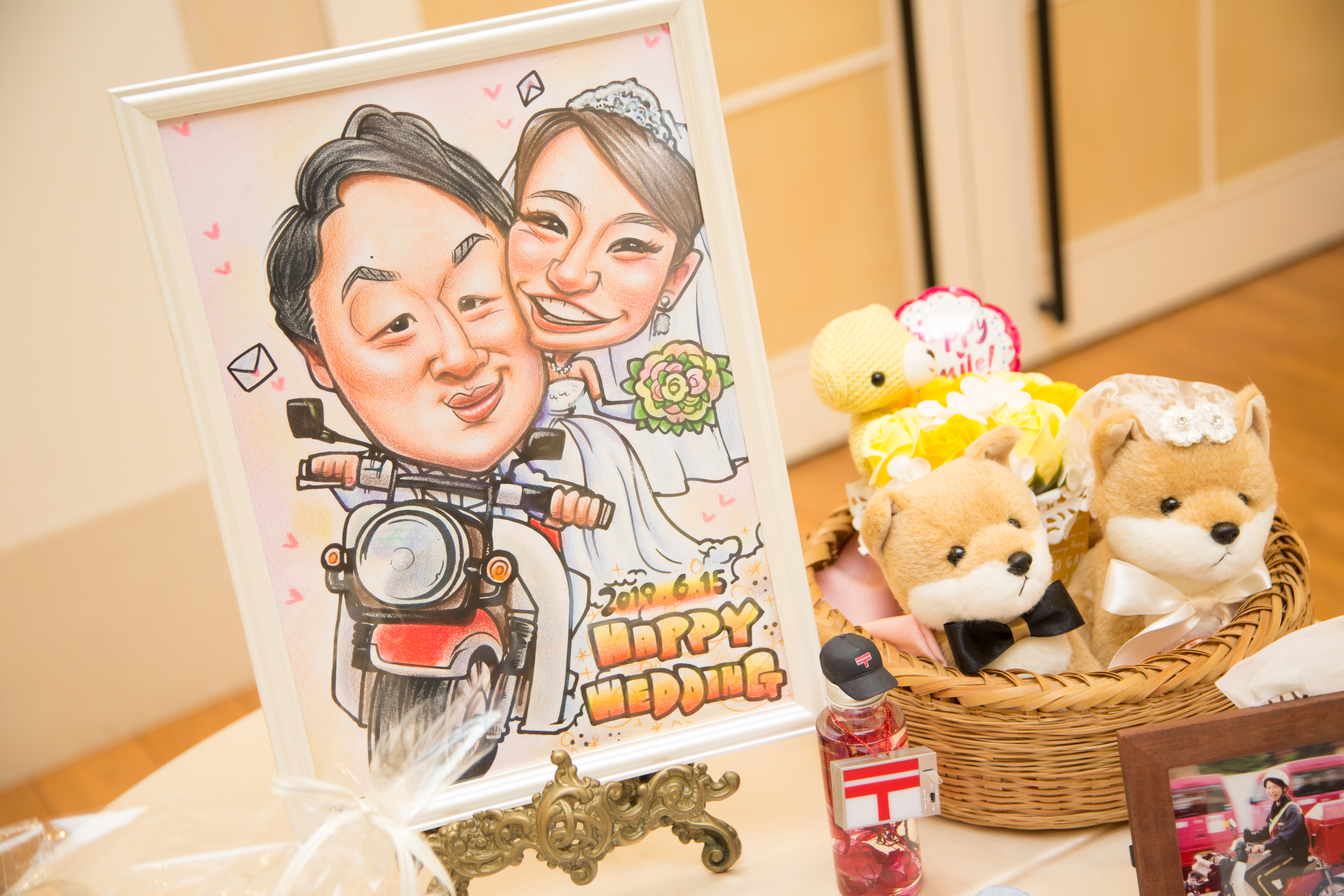 お二人と趣味のバイクを一緒に描いた似顔絵ボード