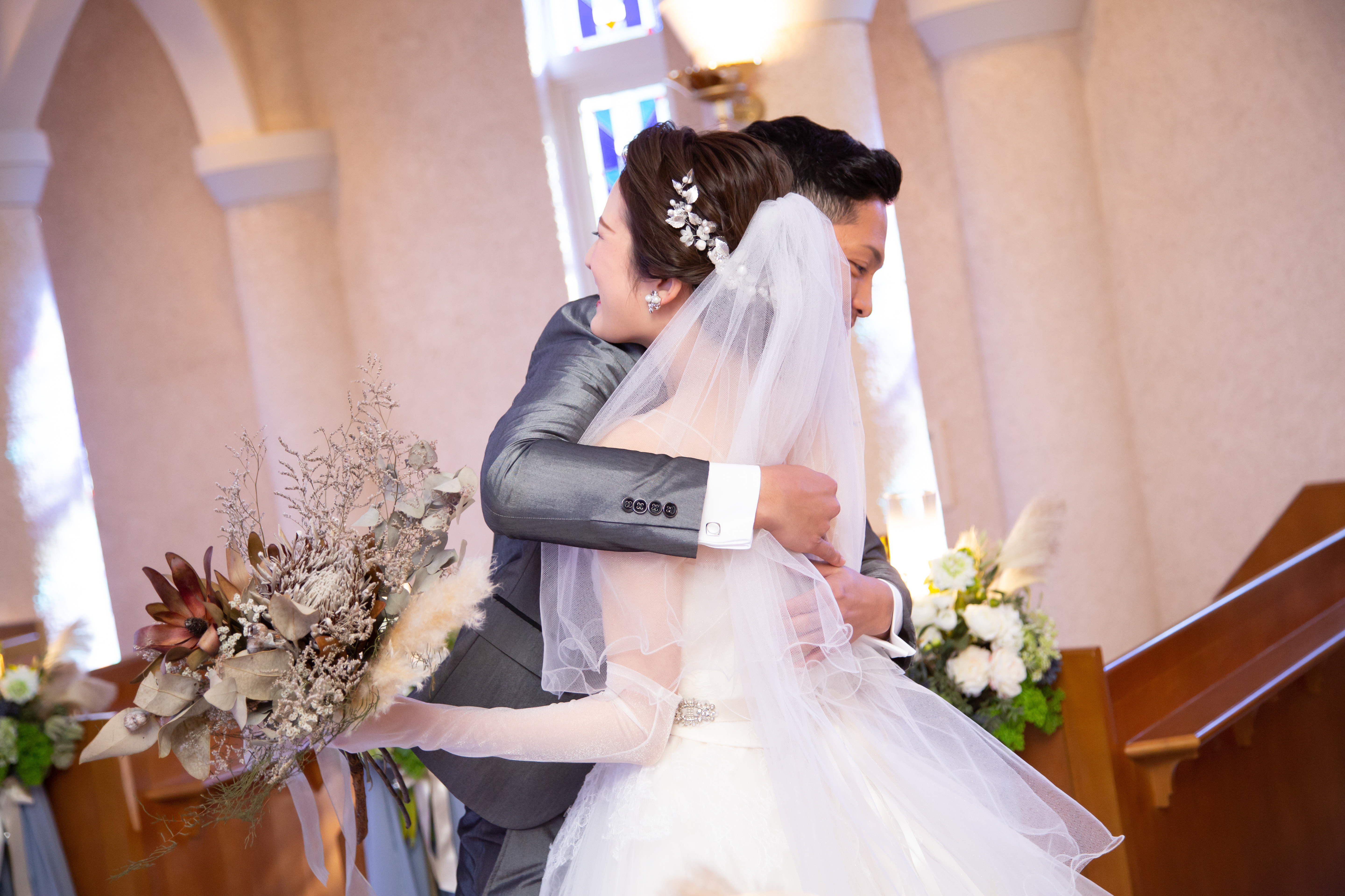 あまりの美しさと嬉しさに思わず新婦様を抱きしめる新郎様