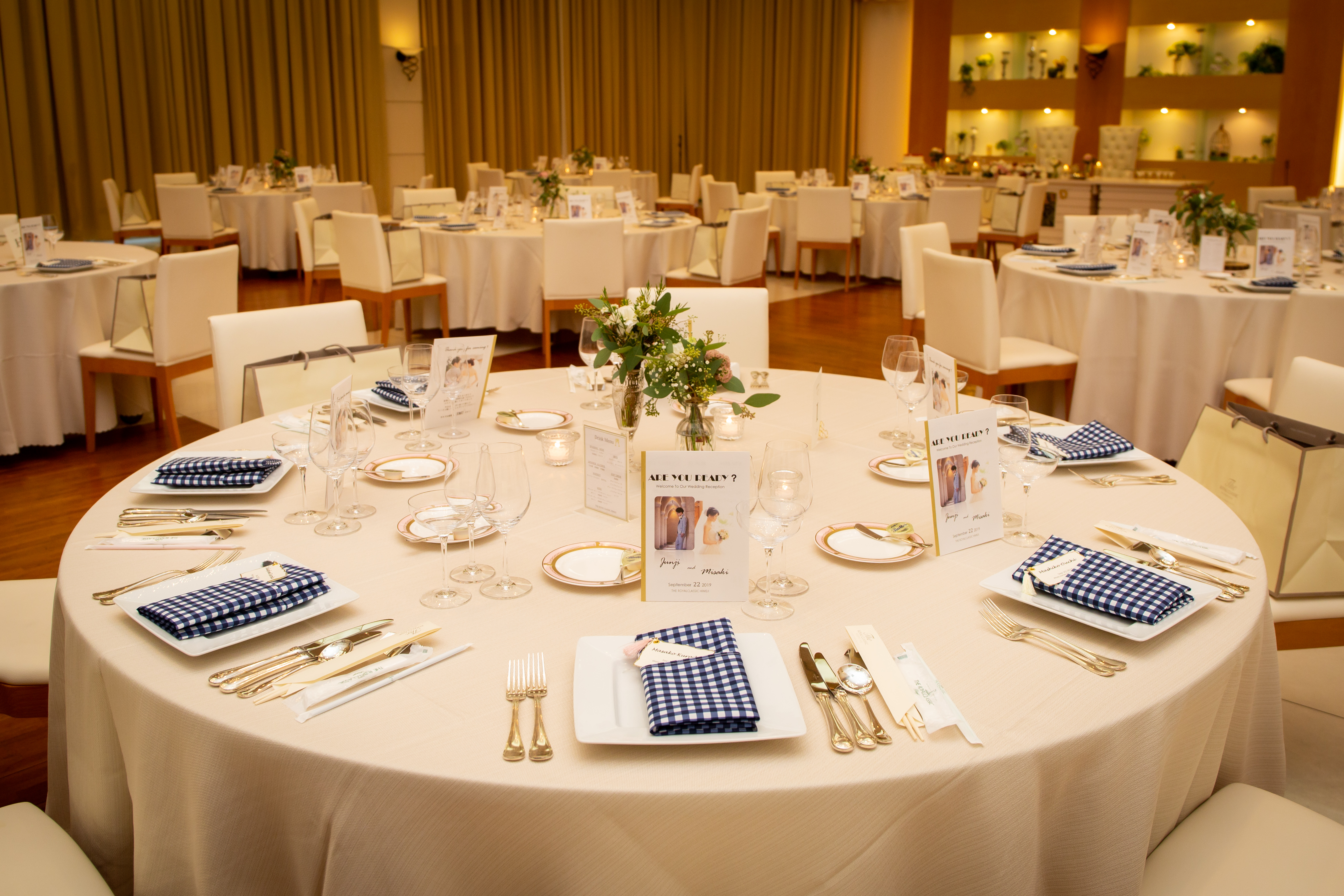 白っぽいクロスに ブルー×ホワイトのナフキン