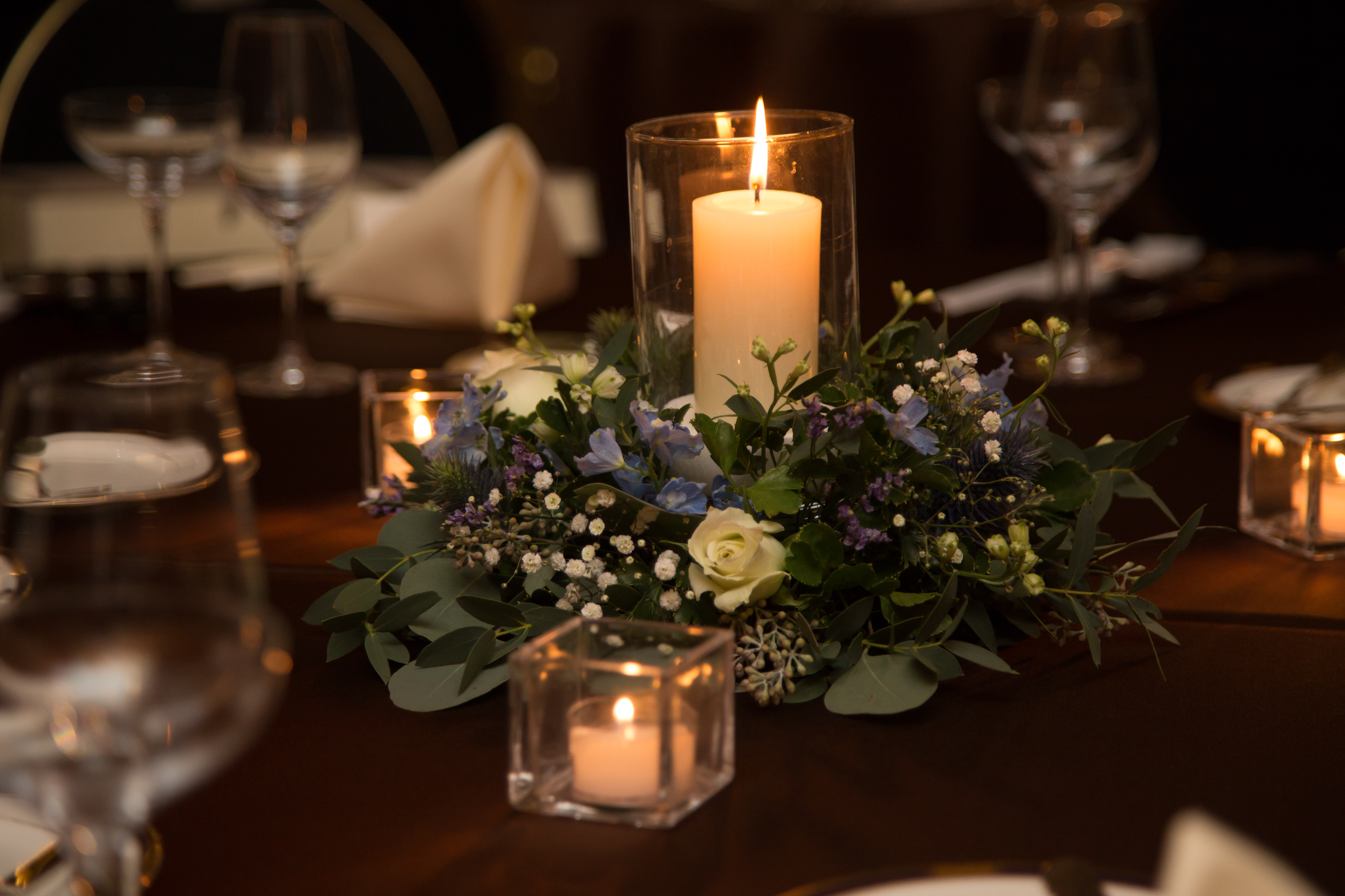 卓上装花とキャンドルで暗くなりすぎず