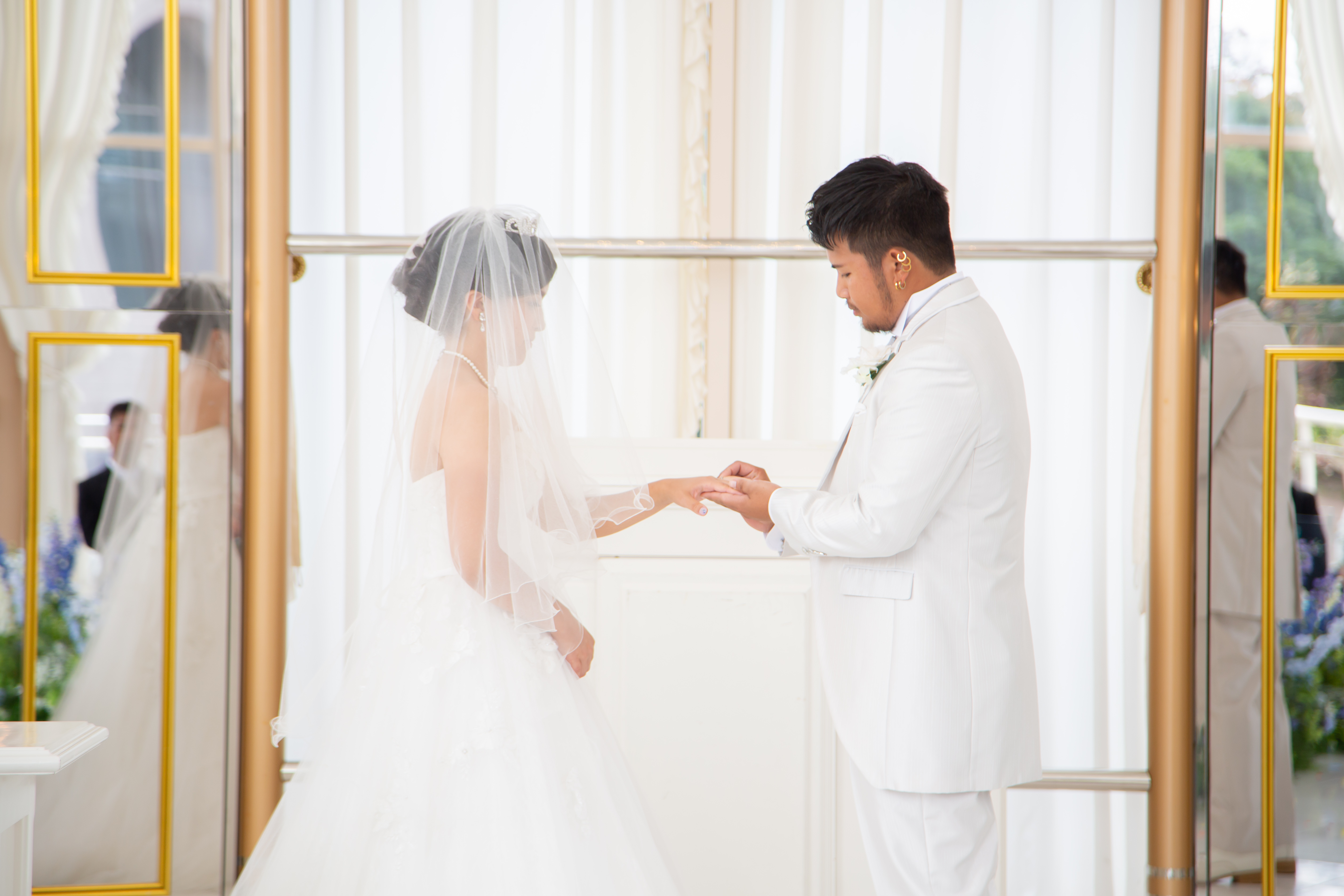祭壇の上へ新郎新婦様にお進み頂き 愛を誓い 指輪の交換をします