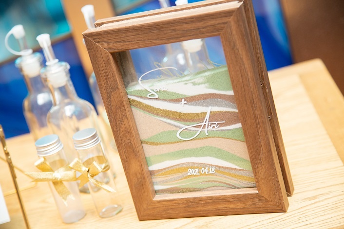 色のついた砂を 1つのケースに入れて頂く演出となっております