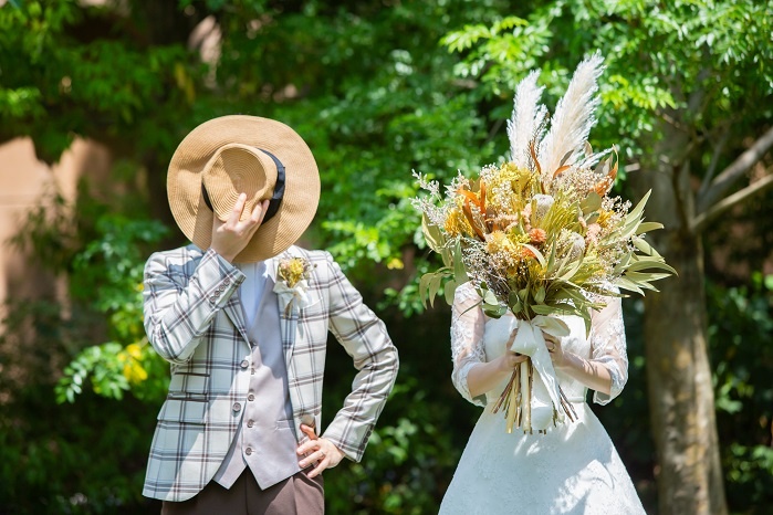 大きなブーケと帽子が印象的