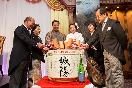 皆様で樽酒の鏡を 木槌で開いて頂き