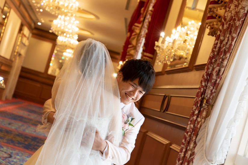 新婦様の素敵な姿に思わず抱きつく新郎様