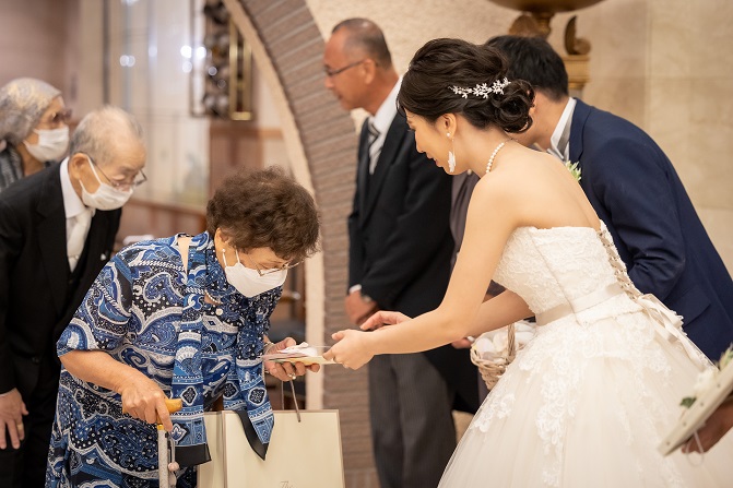 新郎新婦様と親御様で並び ゲストの皆様をお見送り致します