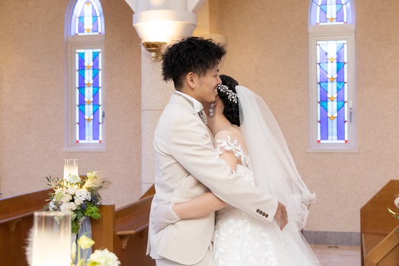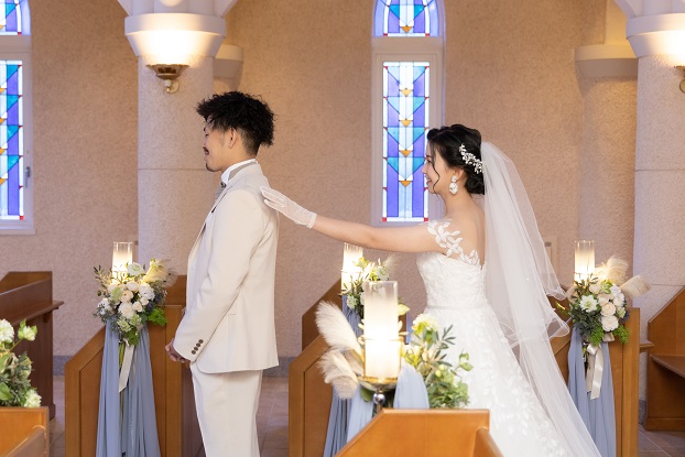 新婦様は新郎様の左肩をそっとたたくと・・・