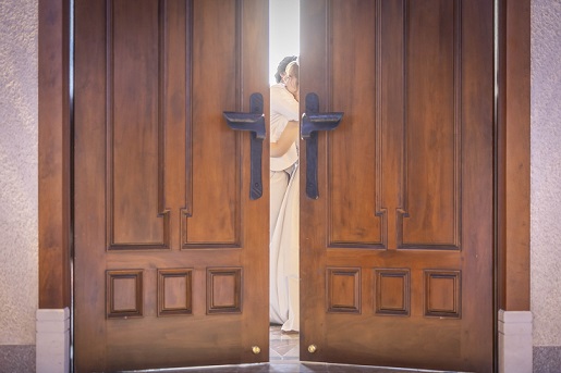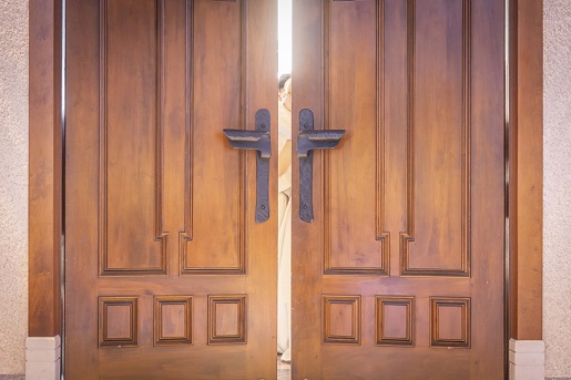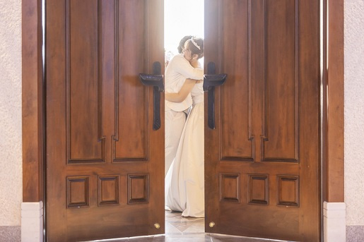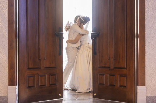 扉の前でそっと向き合い 優しく抱きしめ合う瞬間--