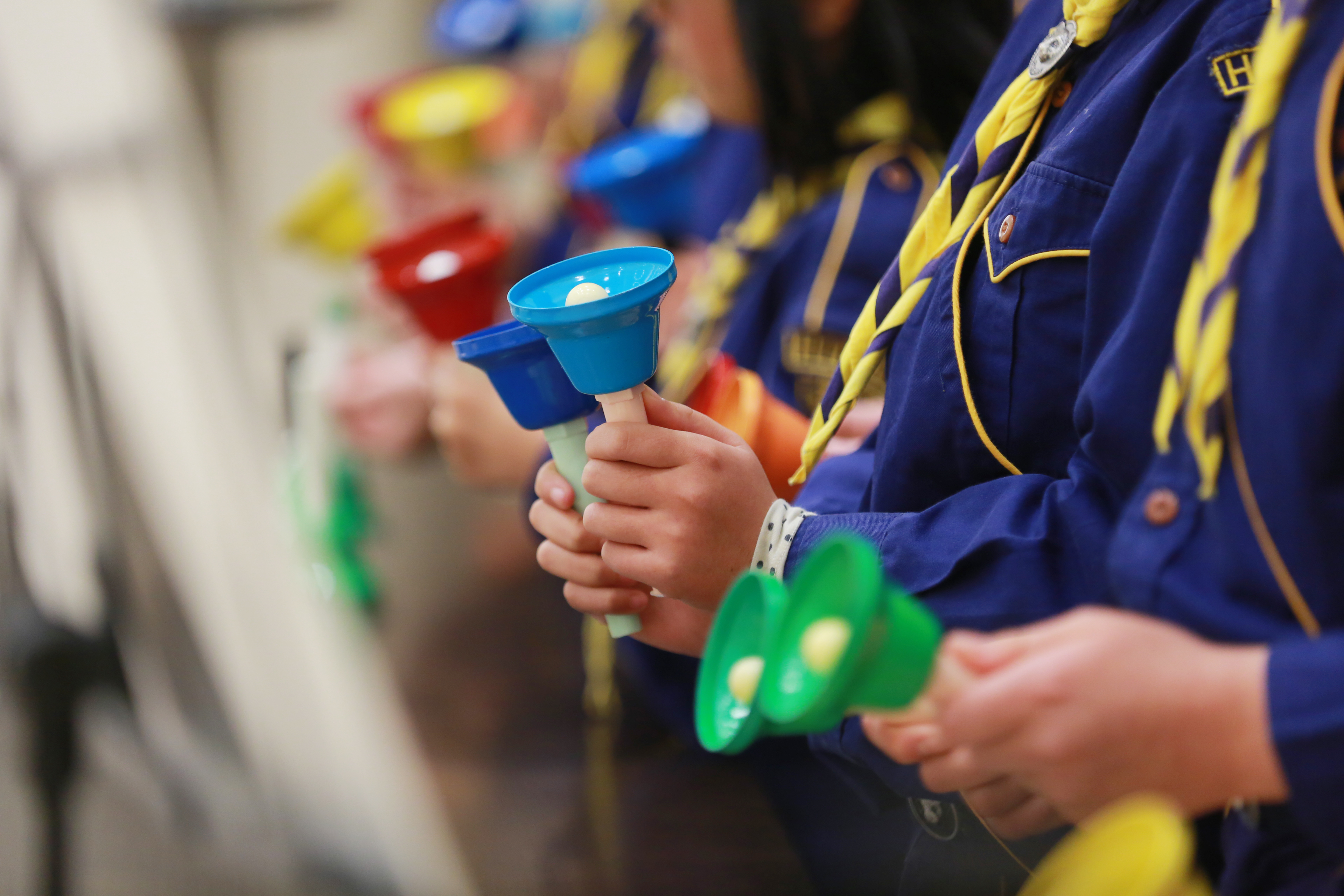 子供たちから、いっぱい練習したハンドベル演奏とお花のプレゼントを頂き