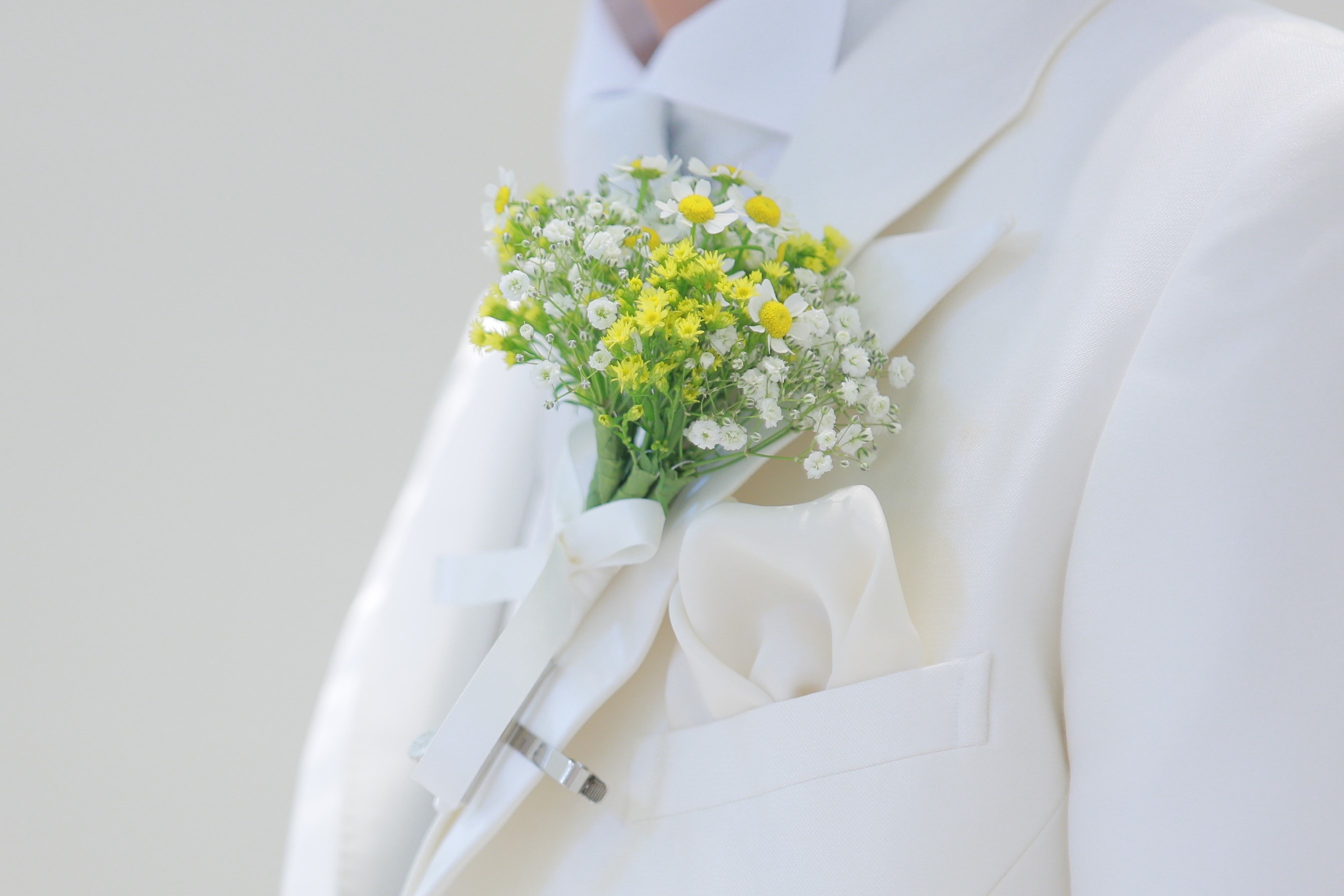 いつもアールベルアンジェ豊岡のブログをご覧頂き、ありがとうございます。 本日は、『ブートニア』について紹介致します。 ブートニアとは、上着の襟のボタンホールに挿す花、 または小さな花束のことを表します。 むかし、 『男性が花束を送ってプロポーズした際、 結婚がOKならば、花束から一輪の花を抜いて 男性の左胸のボタンホールに差し込む』 それが男性からの愛を受け入れた証拠となりました。 これがブートニアのはじまりと言われています。 ブートニアとはフランス語で「ボタンホール(襟穴)」を意味します。 なので、上着の左胸のボタンホールに差すのが正式なかたちとなります。 新婦様が持つブーケと同じ花材でつくることで 二人の統一感も出ます。 色味やお花のかたちで、印象が大きく変わるので ぜひ!こだわられては いかかでしょうか( ^ ^ )**