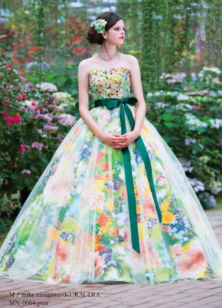 鮮やかな花々で彩られ、華やかで美しいドレス。