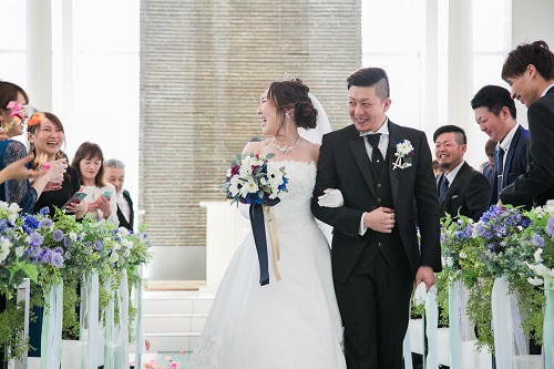 チャペルから退場する時に大好きなゲストに囲まれて笑顔で退場するお2人