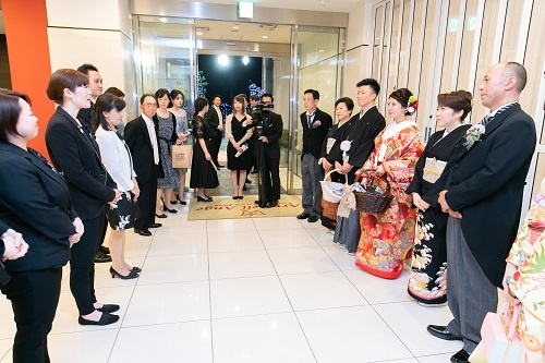 アールベルアンジェ秋田では結婚式当日の最後に担当させて頂いたスタッフが新郎新婦様 ご両家様の所に並び
