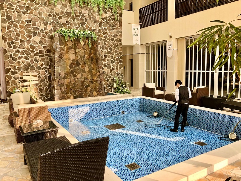 明日は、新郎新婦のお二人が、プールの飾り付けに来るので