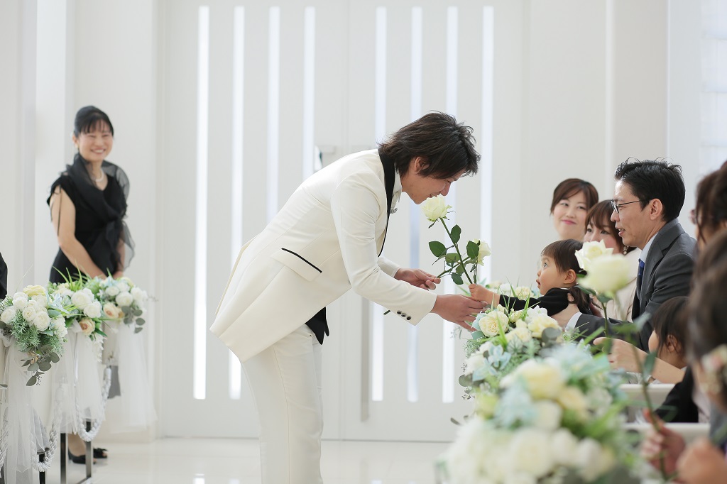 セレモニーでは、新郎様がゲストから1本ずつバラを受け取ります。