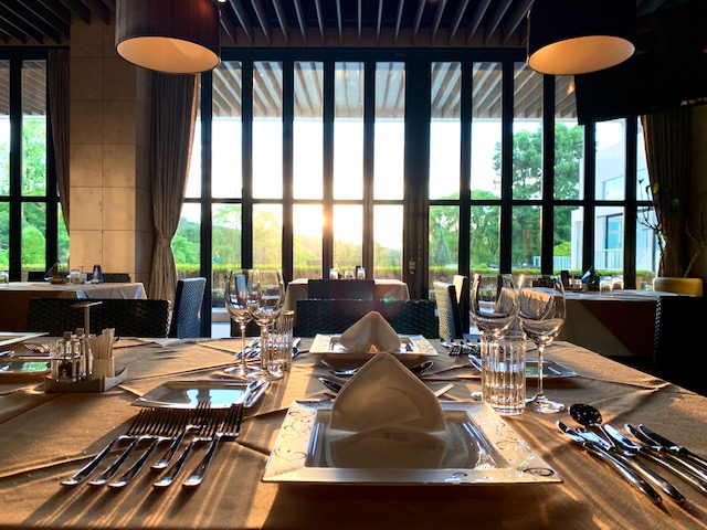 夕陽がグラスやナイフに当たって