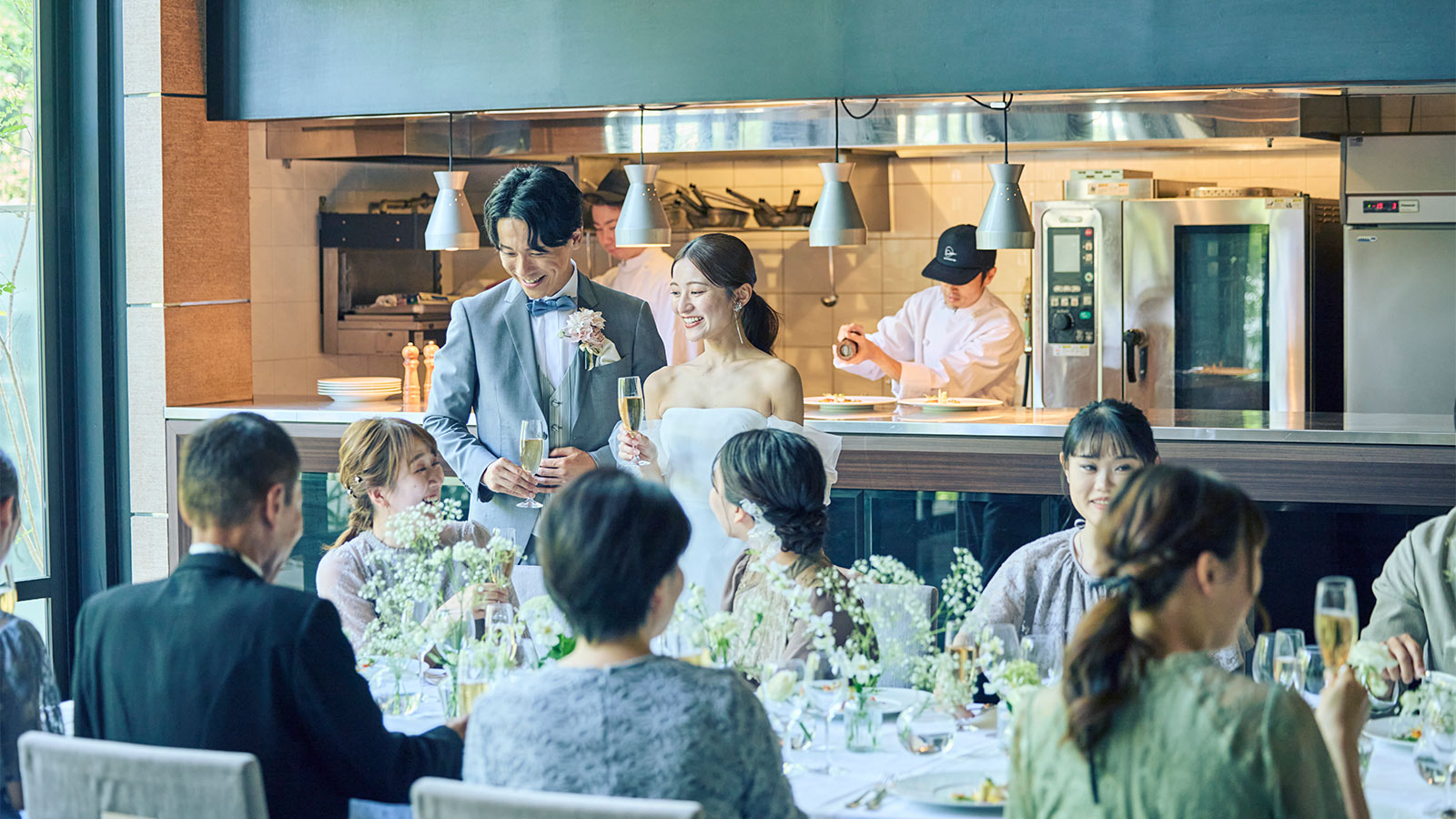 オープンキッチンから届く出来立てのお料理と落ち着いた空間で、会話と美食を楽しむ上質なパーティが叶います。二次会や少人数婚にも最適です。