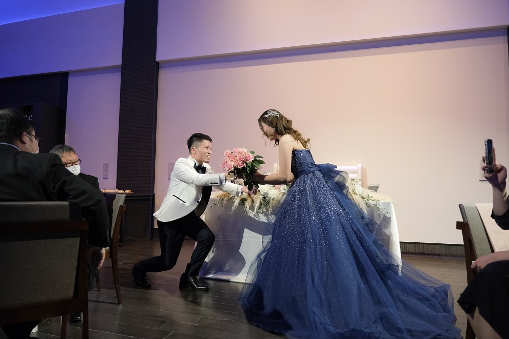 そして 新婦が12本のバラの中から1本選んで新郎の胸に挿す