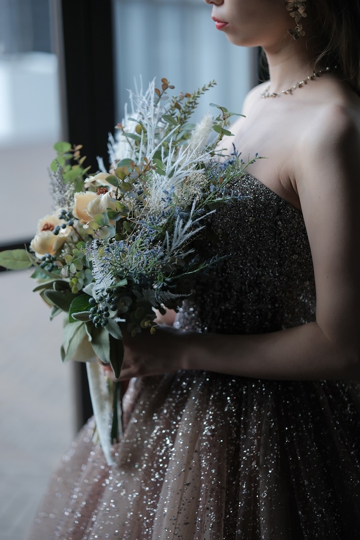 衣装合わせの際に衣裳に合わせた小物やブーケも写真に収めて素敵な一枚を残せるのも良いですよね〇