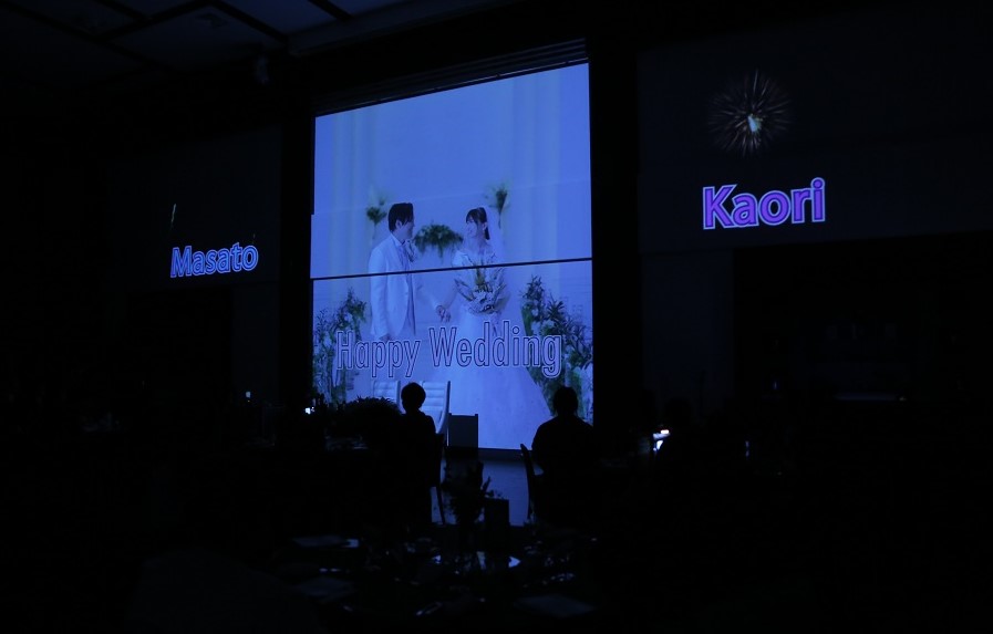 披露宴会場のマッピングは正面の壁一面に映し出されお2人の写真を入れ込むことが出来ますので事前にお写真お預かりして当日用意させていただいております