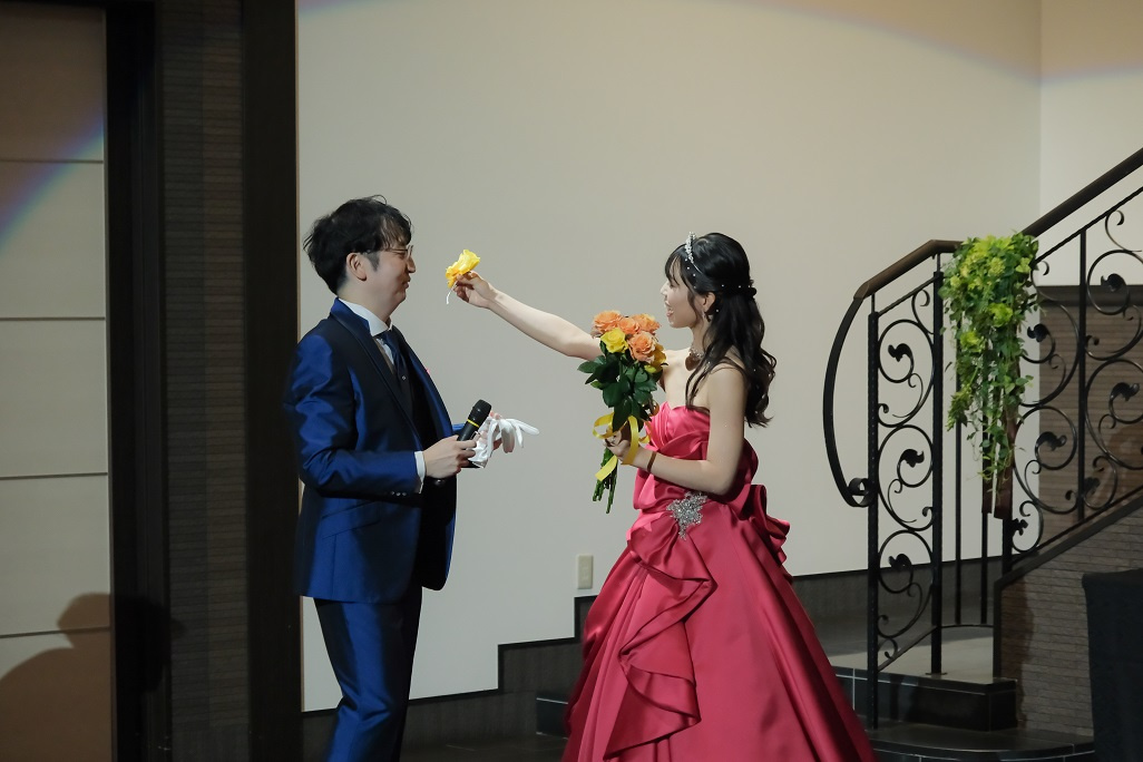 その中の一輪をプロポーズのお返しとして新郎の胸ポケットに挿すという特別な演出です